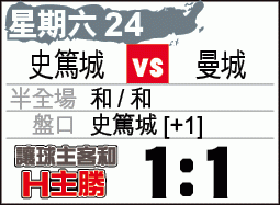 史篤城縱換帥,但陣容未有大變,中堅組合賀夫及梳爾哥斯確較上季穩陣,3場聯賽只失兩球,死球戰術亦有威脅,以曼城前仗不敵卡迪夫城,應付高空波能力疲弱,史篤城狂轟料搵到食。雖然國際賽期間,主隊增添了格連韋倫及查理阿當等傷兵,不過近5季聯賽史軍主場對曼城,累積1勝4和佳績,當中有4次開出1:1波膽,今仗不妨再追此6.7倍波膽。
