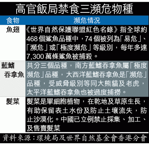 社會支持停吃瀕危物種聲音嘹亮,政府昨終公開承諾,在公務酬酢活動中採用具保育意識的菜單,剔除魚翅、藍鰭吞拿魚及髮菜。政策局及部門出席外間酬酢活動,應盡量事先通知主辦單位不會進食該三款食品,亦應鼓勵公營機構採取類似安排。