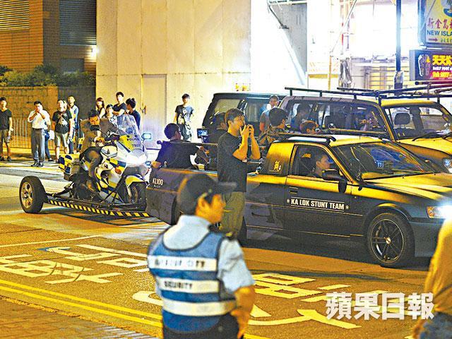 前晚大概11點鐘,崔始源着住成套西裝到場,成班工作人員即刻招呼佢,錢嘉樂仲透過繙譯同佢講解戲份,只見佢不停對住嘉樂點頭。之後嘉樂嘅飛車特技隊開咗部六輪車出嚟,上面固定咗一部道具警察電單車,畀崔始源坐上去。正式拍攝時,工作人員就喺廣東道街頭同街尾封路,架六輪車開始沿住廣東道高速飛馳,崔始源對住鏡頭做出左閃右避嘅動作,七情上面,扮到好似真係自己飛車咁。架六輪車先後來回廣東道四、五次,嘉樂好緊張不停攞住兩部對講機指揮,反而兩位導演好悠閒咁傾偈睇鏡位。