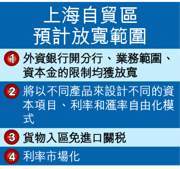 【本報訊】上海自由貿易區將於本月29日揭牌,雖然外界相信屆時可能只是一個儀式,多於實際公佈詳情,但根據上海市政府參事室主任王新奎所指,自貿區對外資銀行開分行、業務範圍、資本金限制會適度放寬,看來內地金融改革步伐不容小覷。