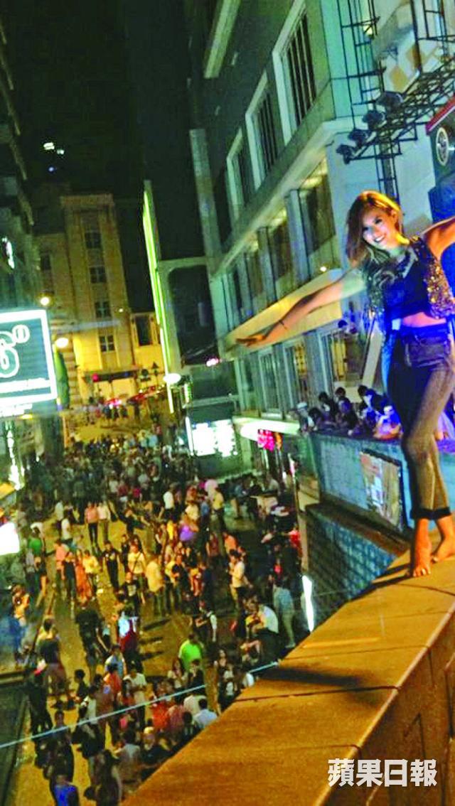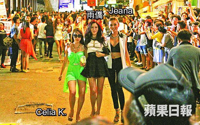 電影《喜愛夜蒲3》演員許亦妮、雨僑和何佩瑜(Jeana)等,前晚在中環蘭桂坊人流最多的斜路拍攝opening場面,穿超低V背心的Jeana擠出東西半球,還有逾廿位𡃁模個個拋胸、晒腿各出奇謀,吸引逾百人圍觀及拿起手機拍攝,更有人大嗌:「Beautiful!」