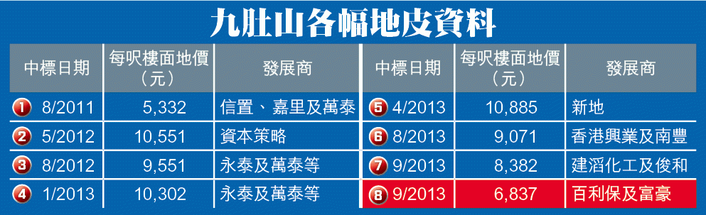 【本報訊】沙田九肚山地價近半年急瀉,最新成交地皮,每呎樓面地價連破兩關,跌穿7,000元水平。百利保(617)及富豪(078)以每呎6,837元,輕易摘取九肚山麗坪路上最後一幅地皮,業界認為未來非市區的大幅土地,在政府源源不絕的供應下,地價將繼續受壓;低價賣地未即時影響同區二手業主心態。