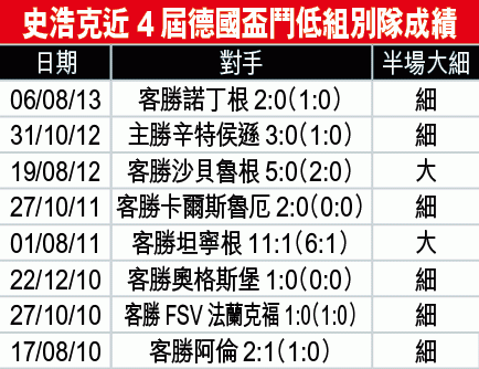 連同今屆在內,史浩克近4屆於德國盃鬥低組別球隊,8戰全勝,可是半場少交收,當中有6場的半場總入球是於1球或以下,開出了2「半大」6「半細」。文:青蛙仔