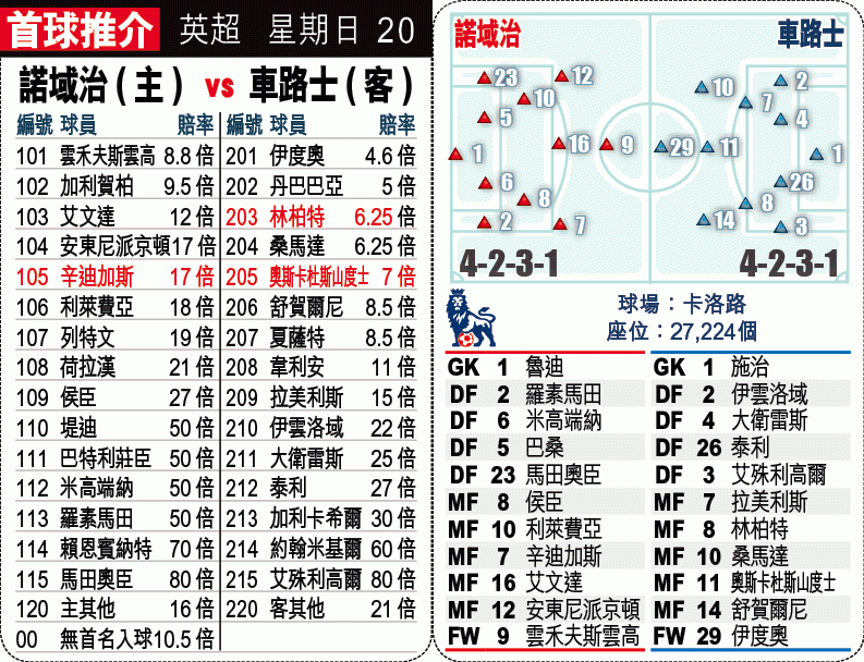 經過季初一輪頹勢後,車路士逐步重上正軌,近4場3勝1和。雖然前鋒費蘭度托利斯停賽,但車路士中場線入球能力極強,且接下來是國際賽期,球員不用留力,故看好他們周日作客可贏「金絲雀」諾域治,不妨直取車路士[-1]「客勝」。(球賽編號:星期日20;now621台今日8:30pm直播)
