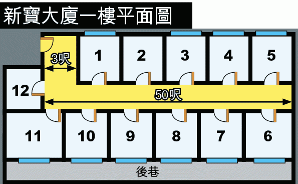 昨發生奪命火警的保安道新寶大廈一樓單位,雖是她手持的其中一個小單位,但回報驚人,「1劏12」僭建劏房,每間租金3,200至3,500元,若全數租出,每月租金收入高達30,000多元。據了解,兩個月前該單位發生電錶爆炸火警,停電個半月,停電期間勞不收租,近日中電已駁回電力,據悉業主準備加租補償停電期間的租金損失。