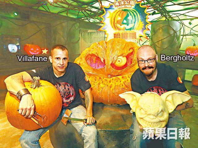 【本報訊】海洋公園明起在哈囉喂其中一個景點南瓜怪傑工作室,展出本港有史以來最大的南瓜雕刻,該巨型雕刻由一個逾1,000磅的巨型南瓜和數個不同體積的南瓜組成,由美國雕刻大師Ray Villafane及Andy Bergholtz創作,作品展示一隻大耳妖怪(圖中)正坐在巨型南瓜上享用其南瓜餐。