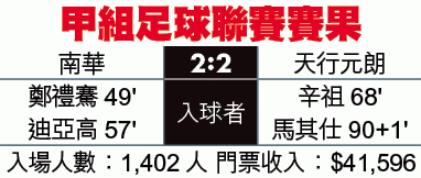 【甲組足球聯賽】「升班馬」天行元朗繼上仗完場前逼和愉園後,昨到訪香港大球場上演的甲組聯賽,憑馬其仕補時主射罰球中鵠,以2:2逼和一度領先兩球的南華。失望的南華主帥張寶春賽後解釋,球員應付比賽經驗不足,場內沒有球員可以帶動球隊應付不同情況。