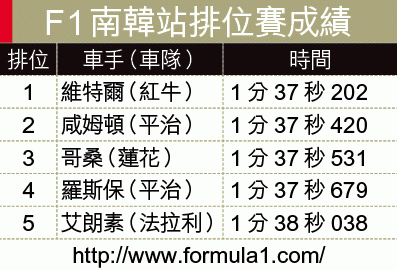 【綜合南韓外電】在車手榜已遙遙領先60分的紅牛車手維特爾,上周六在F1南韓站排位賽,順利以1分37秒202的最快圈速,取得排頭位資格,是他今季第8次排頭位出戰;平治的咸姆頓與紅牛的韋伯,則分列2、3名,不過因為韋伯在上站新加坡站違規,被罰退10位至第13位出戰。維特爾對周日的正式比賽充滿信心,他說:「上周五的試車並不順利,幸好上周六扭轉了,目前戰車各方面都很平衡,我有信心再奪冠軍。」(now671台今日1:45pm直播)