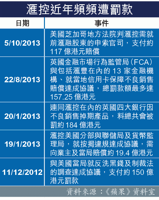 去年底匯控因捲入助洗黑錢醜聞,與美國當局達成延後起訴協議,集團須為此支付共19.21億美元「押金」,並接納為期5年「假釋緩刑」的協議,「守行為」期內,集團須接受監管及執法當局,評估監察其改善進度。匯控在該次支付的訴訟和解款額,是美國歷來對全球金融機構最大規模的單一罰款案例。