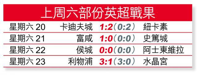 曼城在上周六英超聯賽早場終於反底,主場面對「拖肥糖」愛華頓,雖被客軍「新杜奧巴」盧卡古先開紀錄,不過憑尼格度、阿古路及侯活烏龍球,以3:1反勝,一吐兩連敗烏氣,愛華頓開季不敗走勢亦終被打破,英超今季再沒有不敗之師。另外利物浦持續強勢,主場3:1大破水晶宮,取兩連勝之餘亦升上榜首。