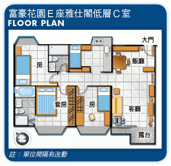 上述單位的廳與房間間隔四正,空間分佈合宜,家具擺位大可以隨心所欲。其中套房可以容納7呎闊的雙人睡床,所餘空間仍十分多,而套廁企浴缸兼備。各個睡房皆設窗台,其中套房及兒童房特大碼窗台上訂造了抽屜,增加實用空間。