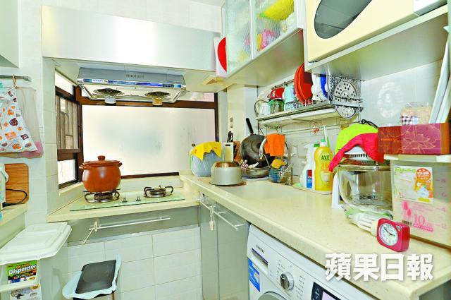 廚房也有窗台,為了善用空間,窗台用作擺放煮食爐具。另外,廚房靠邊位置造有高床,為外傭提供就寢休息的地方。