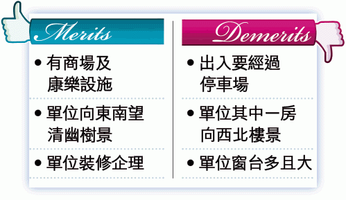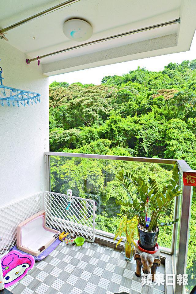 介紹的單位客廳附設露台,平日閒時步出室外,就可以近觀茂密的樹景,滿眼翠綠,感受活力與生機,使人十分心曠神怡。此則三房之中,兩間房間與露台同樣面向東南,景觀一樣,另外唯一面向西北的睡房,則外望屋苑樓景。