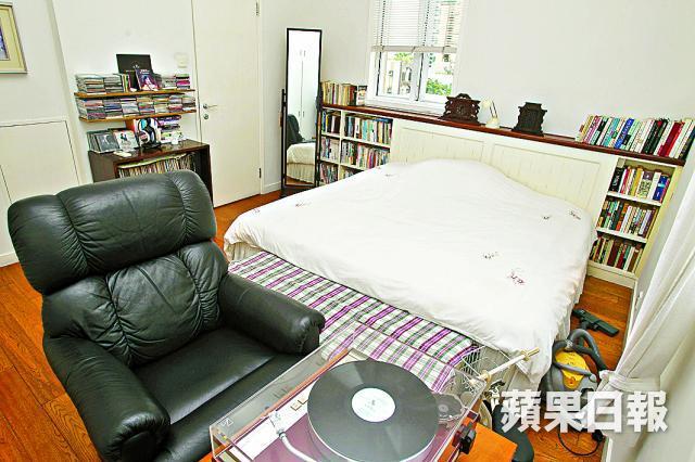 另一間面積較大的睡房則訂造高架組合床,底部放多一張單人床。由於樓底約11呎高,所建閣仔碌架床及組合床,與天花仍有約4、5呎距離,坐於床上無需「頂頭曲腰」。套房間隔廣闊,比起客廳更巨,床尾與衣櫃餘位多,擺放長凳及按摩椅,通道仍闊。