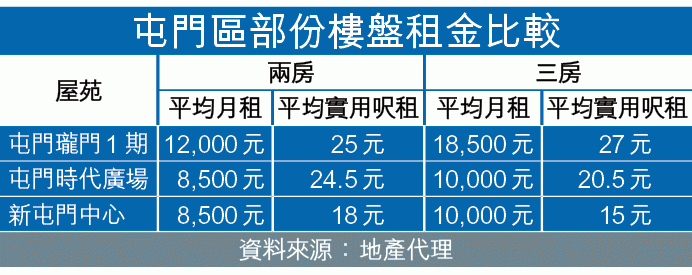 瓏門1期的租盤現已陸續消化,放租約100個,平均整體實呎叫租約30元,較區內二手租盤貴約兩至三成,如屯門主要二手屋苑屯門市廣場及時代廣場,平均實用呎租約22至25元。