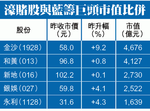 受消息刺激,澳博(880)升5.6%報26.4元;永利(1128)升4.3%報31.6元;美高梅(2282)升4.2%報29.55元,至於俄羅斯賭業概念的凱升(102),配股消息亦冇有怕,昨勁升12%報13.4元。僅昨天單日的升幅,綜合9隻主要賭股為整個行業帶來758億元的市值進賬。