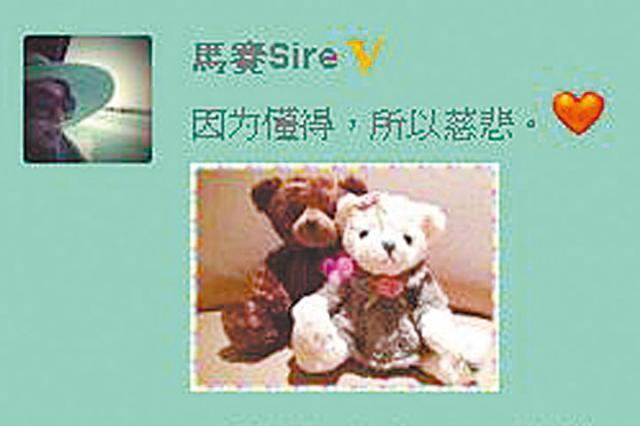 馬賽昨突然打破沉默,晚上7時許在微博留言:「因為懂得,所以慈悲。」還上載一張兩隻啤啤熊公仔的照片,兩隻啤啤熊之間還由馬賽加工印上心心。馬賽雖未詳加解釋箇中含意,但此金句原來來自名作家張愛玲,當年張愛玲愛上不該愛的胡蘭成,曾在寫給胡蘭成的信上寫過:「因為懂得,所以慈悲。」全因對對方有愛,馬賽引用金句,未知是否暗示她與汪子琦的親密關係。