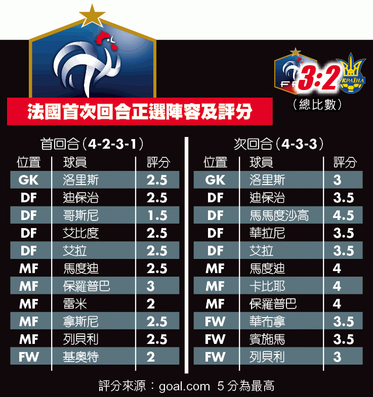 法國死裏逃生!外號「高盧雄雞」的法國,周二在世界盃歐洲區附加賽次回合主場對烏克蘭,教練迪甘斯作出大變陣下,憑重獲正選的馬馬度沙高及賓施馬建功,加上客軍下半場擺烏龍,以3:0勝出,收復首回合失地,兩回合以3:2奇蹟淘汰烏克蘭,晉身明年巴西決賽周。