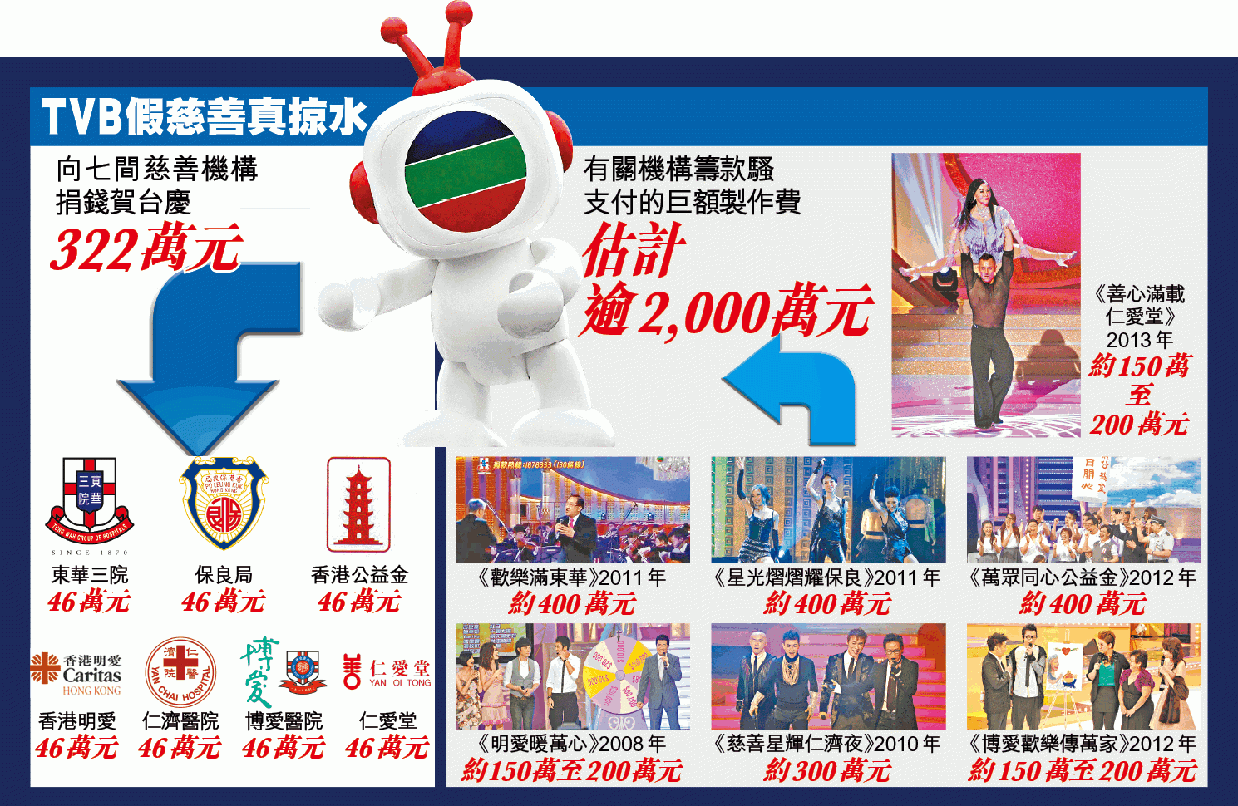 有熟悉無綫運作的業界人士透露,大型機構如東華三院、保良局和公益金的製作費超過400萬元,其次如仁濟等,則約300萬元,相對較細的機構也要百多萬元,每年七間機構合共至少向無綫進貢逾2,000萬元。換言之,市民每年捐出的善款,部份其實落入無綫口袋。