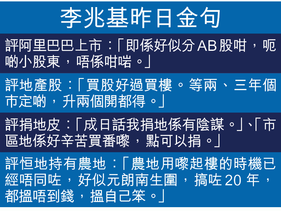 【本報訊】為求爭取阿里巴巴來港上巿,港交所(388)最近積極籌備就少數控權(Minority Controlled)及多重股權結構展開公眾諮詢,不過此舉卻惹來不少爭議,本港四大家族之一、恒地(012)主席「四叔」李兆基更成為首位直接開腔反對的傳統富豪,抨擊以小控大或AB股等制度是「呃啲小股東,唔係咁啱」,似乎暗指合夥人制對小股東不公平。