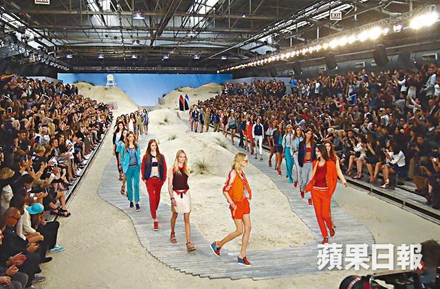 Tommy Hilfiger時裝騷近年越玩越大,曾在軍校搭建Central Park主景,今次將Pier 94變成西岸沙灘,鋪滿幼沙、小沙丘、滑浪板裝飾,襯托蜿蜒runway,與新裝海藍、三文魚、裸色主導的sun-washed色調,諧和地呼應,睇騷的fashionista彷彿去了一次沙灘。