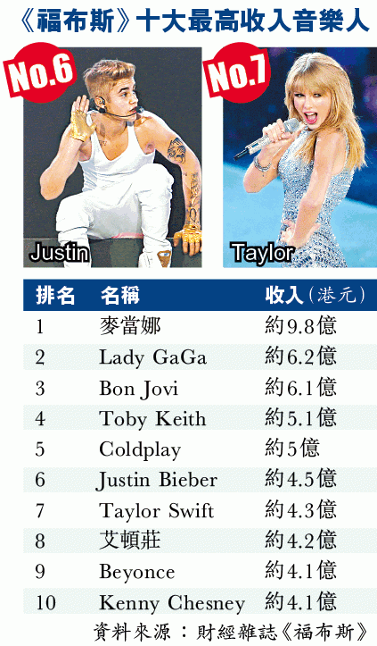 同樣打入榜的還有年賺5,800萬美元(約4.5億港元)的加拿大小天王Justin Bieber,但連番闖禍的他又發生辳事,事緣小Justin近日去了墨西哥開騷,於網上留言指自己與墨西哥總統培尼亞(Pena Nieto)見過面,搞到培尼亞前日在網上澄清指自己沒有與小Justin見過面,小Justin刪留言兼澄清,自己只是與總統家人及其朋友見過面。