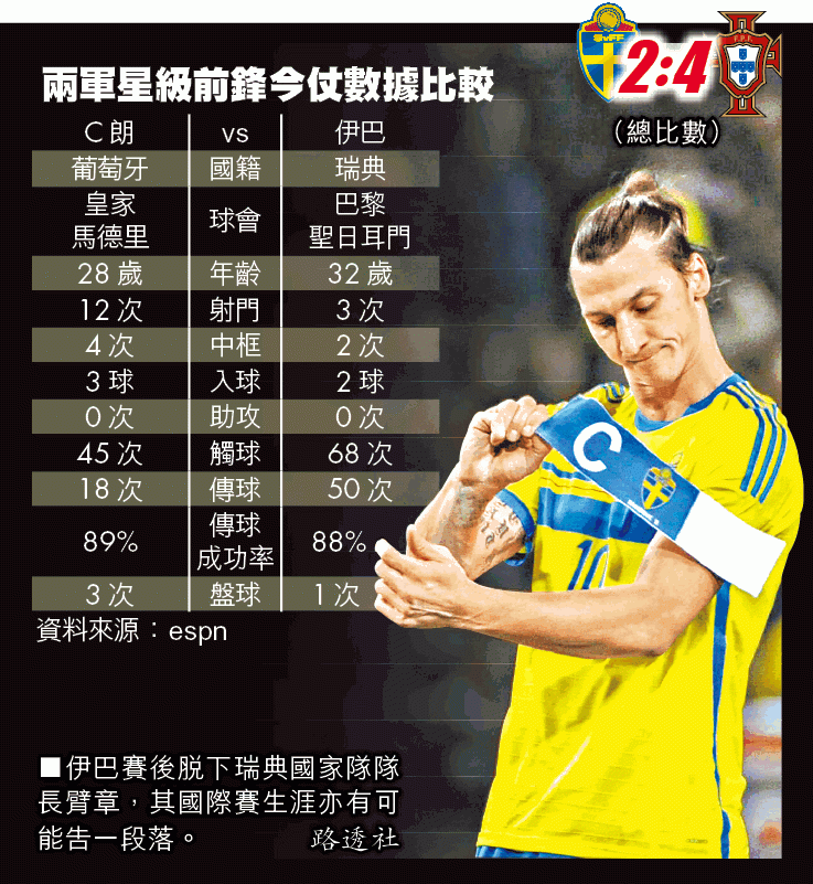 C朗VS伊巴,這場世界盃附加賽矚目的球王大戰,C朗成為最後英雄!周二次回合瑞典主場迎戰葡萄牙,瑞典射手伊巴謙莫域梅開二度將比賽推上高潮,但葡國球王基斯坦奴朗拿度(C朗)更勁,大演帽子戲法助客軍以3:2反勝,兩回合計以4:2淘汰瑞典,進軍明年決賽周。
