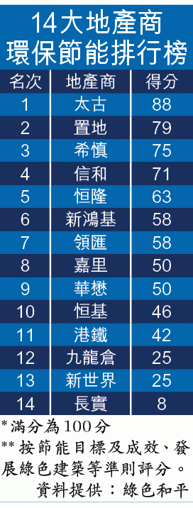 【本報訊】綠色和平檢視全港14大地產商公佈的建築物能源使用指數,及近3年的年報和環境報告,發現長實並無為節能設目標,只在年報上列明會使用環保燈泡,在評分滿分100分中,長實僅獲8分,成為節能最「hea」地產商,跟排首位的太古得分相差10倍。