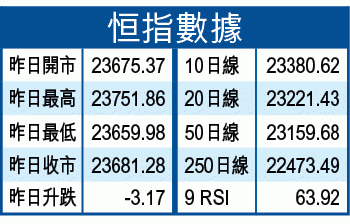期指結算臨近,加上MSCI指數昨收市後換馬,市場觀望氣氛濃厚。恒指昨日低開9點後,早段最多倒升67點,高見23751,大部份時間於23700水平徘徊,惟尾市再度回軟,最多跌25點,低見23659,收報23681,跌3點,成交674億元。
