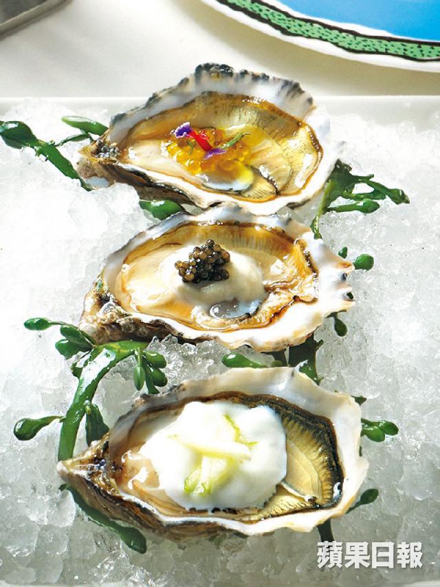 生蠔三重奏選用了法國Gillardeau,此蠔鹹甜度平衡做得十分之好,易於配搭不同食材,嚐味次序應由濃至淡,(上起)先嚐欖油生蠔、花椰菜及魚子醬生蠔、辣根醬生蠔。$260/b