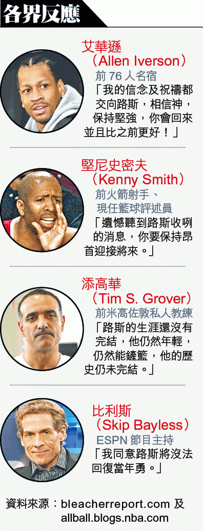 但對公牛來說,更擔心是路斯未來前途,就算他年僅25歲,但雙膝都曾接受大手術,復出後能否回復昔日爆炸力也成疑問,正如07年最佳新人萊爾,在效力拓荒者時也因半月板受傷,要在當打之年28歲收山(見另稿)。綜合美國外電
