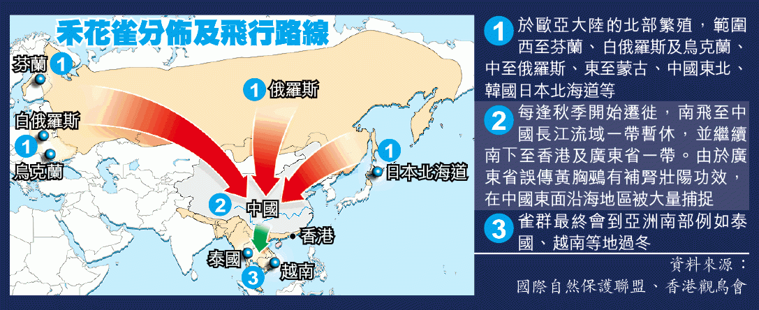 該會研究經理余日東表示,禾花雀本來廣泛於歐亞大陸北部繁殖,西至芬蘭中至哈薩克、東至日本北部都是繁殖地,牠們會在秋冬季期間南下,在東南亞等地區過冬。但多年來面對過量捕獵、棲息及覓食的農耕地越來越少,使其數量日漸下降,近三年芬蘭更沒有繁殖紀錄,「過去10年間數量至少跌咗五成以上,係IUCN將佢列為瀕危嘅主要原因。」與此同時,禾花雀在各個越冬地錄得的數量已同樣大幅減少。