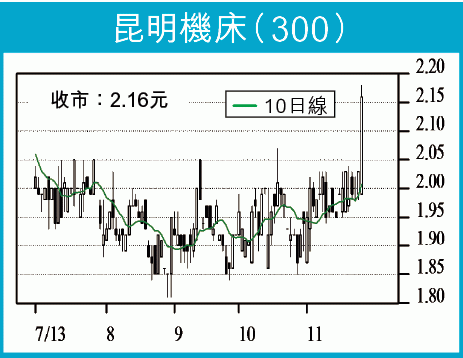 市場資金轉炒個別落後股,其中一隻是國企昆明機床(300),公司主要從事機床系列產品及配件,今年中期虧損4,361萬元(人民幣.下同),生意額則為3.53億元,因業績差股價亦越跌越殘,好多殼股市值都大過佢。