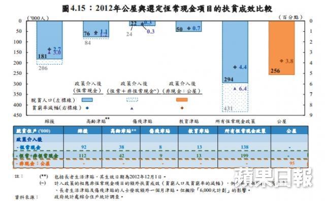 他指出,政府曾公布2012年公屋的扶貧成效數據,「公屋幫到25.6萬戶人脫貧,但綜援、教育、加高齡及傷殘津貼等,所有恆常現金政策的總和,亦是幫到29.4萬戶人脫貧。兩條數其實差不多,換言之,一間屋的扶貧成效,佔整個政策很重要環節。」
