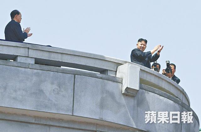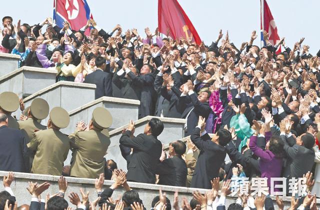 透視在齊一的人海間,領導人金正恩出來揮手,底下人民臉上展現曙光般的欣喜若狂的奇景。