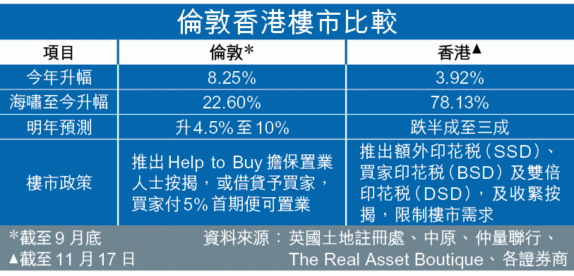 根據英國土地註冊處數據,截至今年9月底,金融海嘯至今倫敦樓價累升22.66%,相比香港大升78.13%來說,屬小巫見大巫。不過,今年本港樓價僅升0.25%,為海嘯後表現最差的一年,相反倫敦樓價首9個月已升8.25%,是08年後最勁。