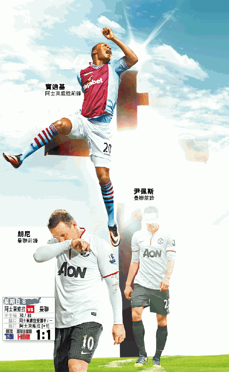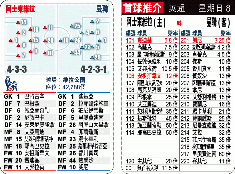 尹佩斯今季傷患頻頻,幸紅魔前線兵源尚足,若主場鬥弱旅,相信會派查維亞靴南迪斯(小豆)打正選,但今仗作客,相信領隊莫耶斯不敢鬆懈,料他沿用上周中的歐聯前線骨幹,由朗尼出任單箭頭,香川真司從後支援,但香川對抗性差,在英超快上快落、防守緊逼的風格中,他一直未能適應。維拉中場若打貼身防守,便可將香川凍結。若莫耶斯變陣,將朗尼移後,鋒線便欠缺獨當一面的大將,小豆獨自搵食能力弱,而韋碧克的把握能力更極差。