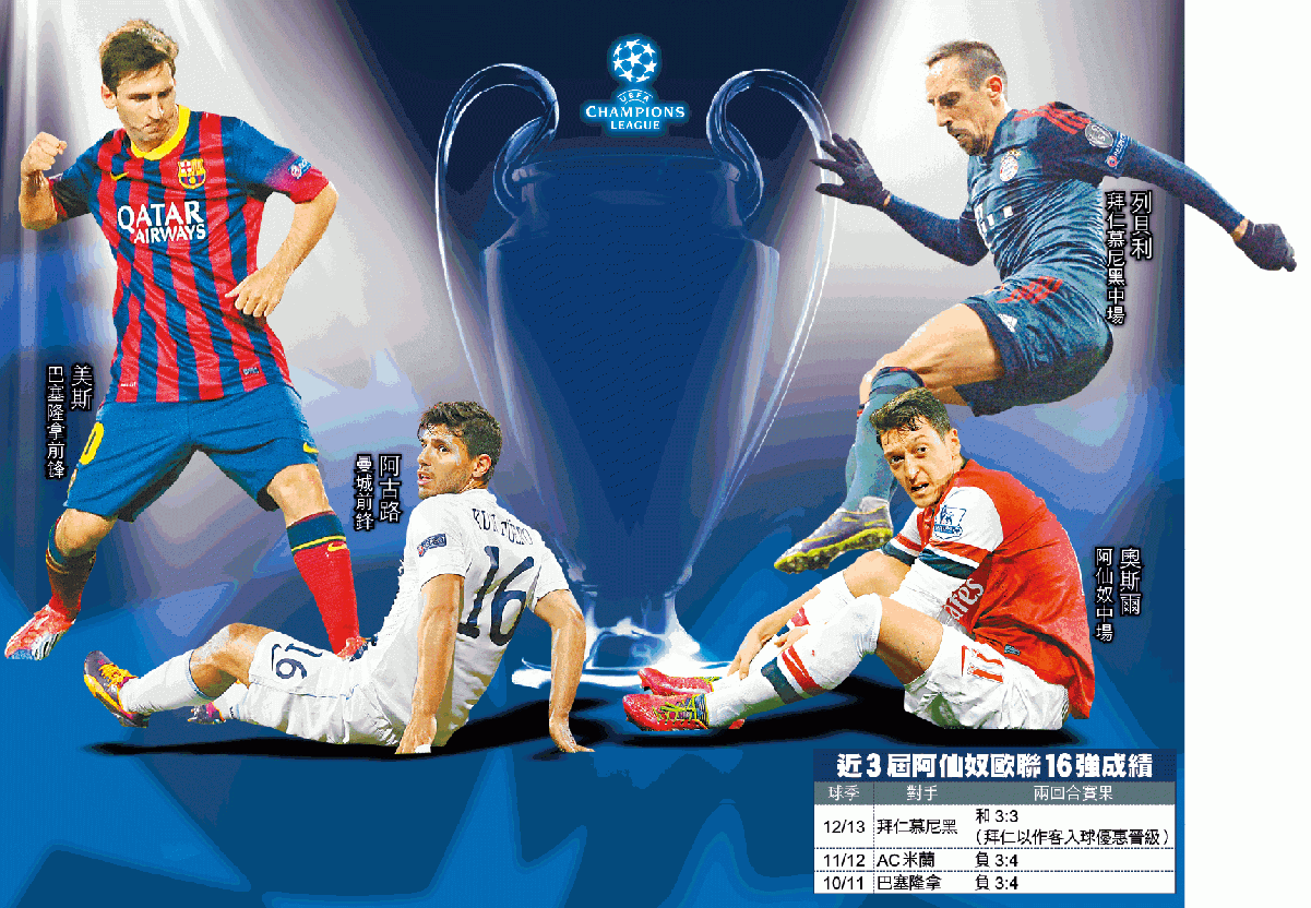 歐洲足協於周一進行歐聯16強抽籤,兩支小組次名的英超球隊曼城與阿仙奴,果然齊齊抽到下下籤,面對實力最強的兩支奪標熱門球隊。曼城遇上西甲班霸巴塞隆拿,阿仙奴則連續兩年在16強鬥拜仁慕尼黑,冤家路窄。