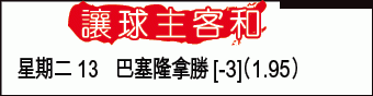 巴塞隆拿首回合雖然已大幅領先,不過周二西盃第4圈次回合主場出擊,一眾年輕小將沒有包袱,料可續炒對手,「讓球主客和」[-3]照取「主勝」。(球賽編號:星期二13;now632台明日5:00am直播)