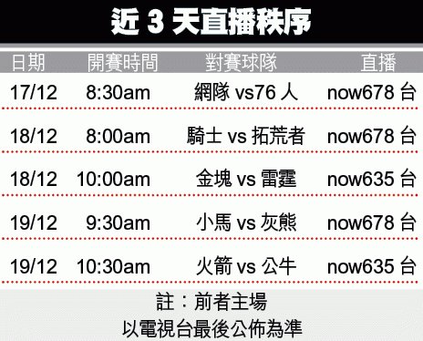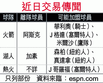 另外,近日有傳火箭另一位中鋒阿斯克,就好有可能喺近日被換走。有美國傳媒話,球會有可能用佢同騎士換入防守型中鋒華利奧。亦有傳火箭嘅目標,係今季加盟鷹隊嘅米爾沙,貪佢肯打爛仔波。聽講塞爾特人嘅J格連,都係火箭嘅目標之一。