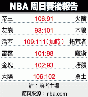火箭周日作客帝王,原本以為就算林書豪背傷唔出得,呢場波都實食冇黐牙,點知主隊有新兵基爾,喺地標戰攻入26分,仲有中鋒吉辛斯貢獻21分、10個籃板,最後客隊以91:106慘敗!火箭仲有射手夏登喺比賽中扭傷腳,認真黑仔。