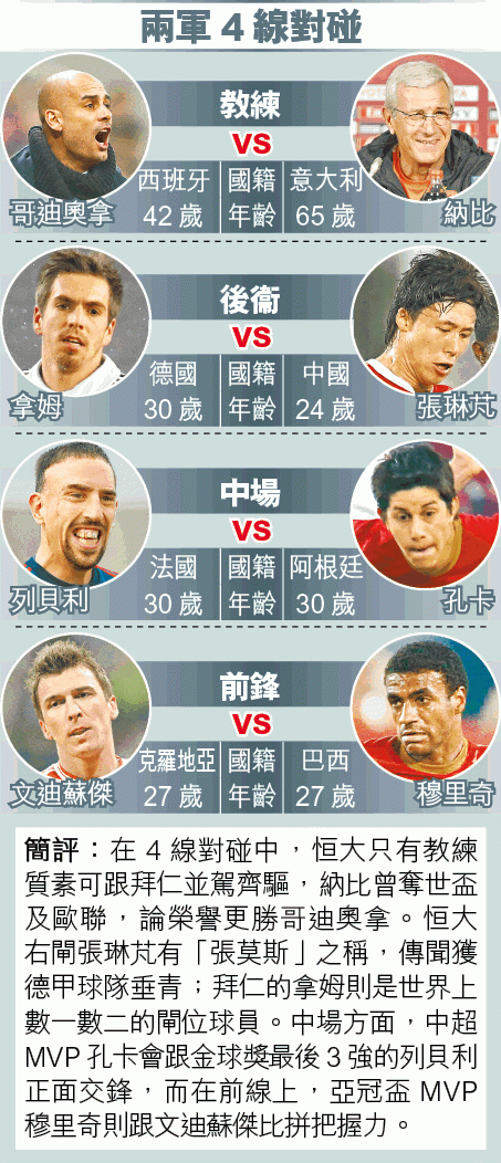 恒大上周六在半準決賽以2:0擊敗艾阿里,周二將會跟拜仁爭入決賽。恒大會以中國國家隊為骨幹,配合幾名南美外援;拜仁以德國國家隊為重心,加上列貝利等世界一線球星,實力明顯遠在恒大之上。教練納比也承認,恒大要有奇蹟才可淘汰拜仁。