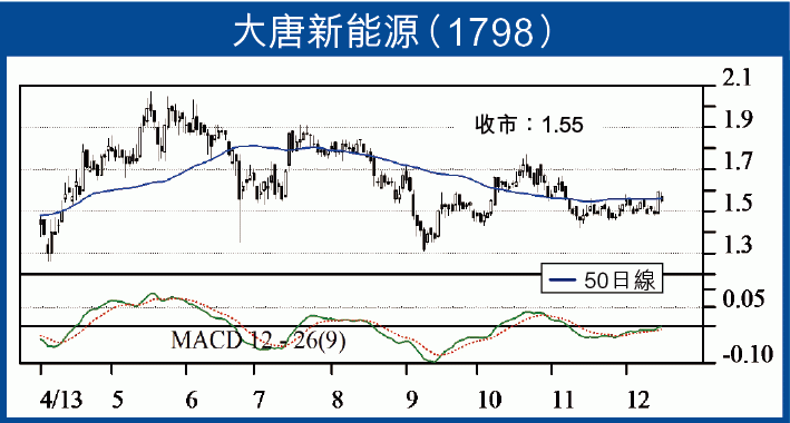 大唐新能源5月高見2元水平後,以大三角形作整固,該股上周五以大陽燭升抵50日線,將已收窄的保歷加通道向上撐開,MACD牛差距擴大,逐漸步向牛區,昨日回落相信只是上周五急升後的正常回調,可於1.55元或之下買入,若能升破1.65元的三角降軌阻力,有條件再挑戰2元,失守1.45元止蝕。