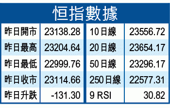 美國議息前夕,港股繼續偏軟,恒指昨日低開107點後,即再考驗23000關口,低見22999,最多跌246點,及後試圖收復失地,跌幅曾收窄至41點,收報23114,跌131點,成交547億元。