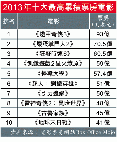據電影票房網站Box Office Mojo資料顯示,由美國男星羅拔唐尼(Robert Downey Jr.)主演的《鐵甲奇俠3》,今年於全球狂掃約93億港元,是今年票房最高收入的電影。至於第二位則是一班可愛迷你兵團比主角更搶鏡的卡通電影《壞蛋掌門人2》(Despicable Me 2),票房全球收9.2億美元(約70.5億港元)。早前炒車身亡的男星保羅獲加(Paul Walker)演出的《狂野時速6》(Fast & Furious 6),則以7.8億美元(約60.5億港元)排第三。有保羅fans更提議將保羅炒車的大道改以Paul Walker命名作紀念,但卻被當地居民指保羅對該社區沒有貢獻而反對。