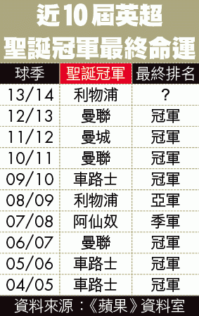 阿仙奴在聖誕前失分,把英超聖誕冠軍的寶座拱手相讓給利物浦,這對紅軍來說,絕對是一大喜訊,因為由04/05球季起計,這9屆的英超聖誕冠軍中有7支都能笑到最後,成功於英超封王!