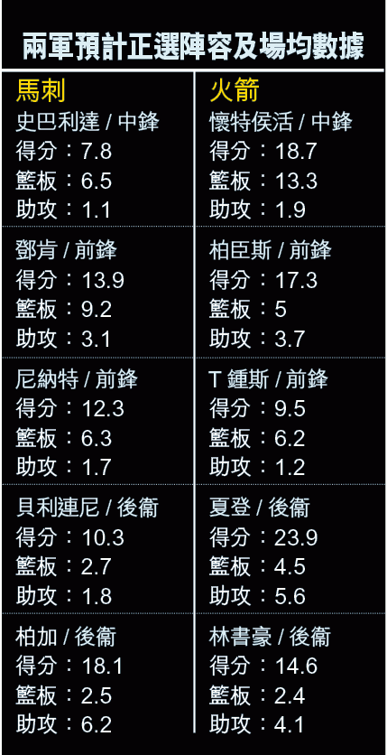 球隊另外兩個得分點,就是「大鬍子」夏登及柏臣斯。兩人內、外投兼備,而且入楔鏟籃亦十分拿手。夏登雖然在周一球隊主場以104:111不敵小馬中,因足踝仍有傷而缺陣,但相信今場大戰會落場。而近日傳出可能被交易送走的林書豪,因背傷而缺陣4場後,在周一的比賽已復出,並有個人獨得20分的表現。不過,火箭的默契和合作都不如對手馬刺,早前更一度鬧出全隊將林書豪視為「出氣袋」的傳聞。文:利司基