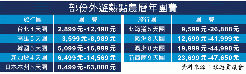 董耀中指出,農曆年最熱門的短線團是日本、韓國及台灣,長線團則有歐洲。其中一個日本本州五天團豪盡全場,團費63,880,按年升73%;韓國、新加坡及北京等豪華團團費升幅也逾五成、台北團升四成。長線團以新西蘭豪華團升幅最驚人,9天收費47,650元,按年升60%,其次是歐洲8天團,團費由去年26,338元大升59%至41,999元。
