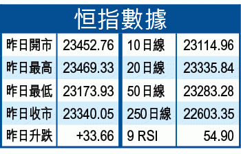 一年伊始,港股差點開壞頭,恒指昨日裂口高開146點後,很快便掉頭回落,最多倒跌133點,低見23173,尾市反彈幸保不失,埋單升33點,收報23340,成交488億元。