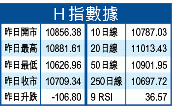 恒指昨日在20日線(23335)高開後即回落,回補即日上升裂口後接連跌穿20日線及50日線(23283),尾市回穩重新收復20日線收鎚頭,MACD重新發出牛差,予人跌不下之感。不過,大市成交不足500億元,反映市場動力欠奉,實際上只是處於好淡爭持的悶局,待下周投資者真正歸位後,才有確方向。恒指昨雖重上20日線,但大市重要阻力是去年底的橫行區底部23500,除非能盡快重上23500水平,方有轉機,20日線昨日進一步跌近50日線,文韜對後市仍有保留。H指昨收10709,跌106點,日圖線再出現穿頭破腳之陰燭,險守250日線(10697),短線料再考驗100日線(10608)支持,中資股弱勢是對後市抱懷疑另一原因。